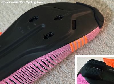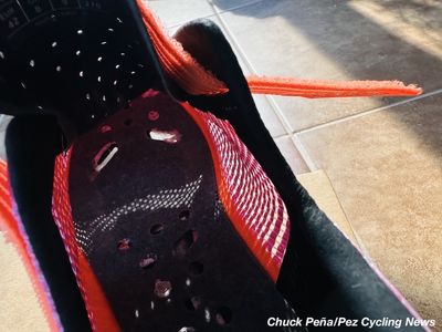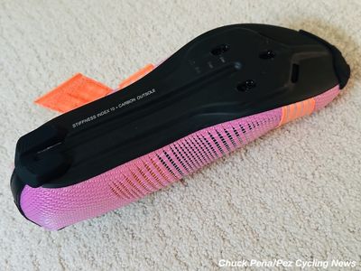 First is the velcro straps. They’re old school tech, but they don’t work like velcro closures of old that pulled the two sides of the shoe (vamps) together across the tongue. Instead the front Powerstrap (to adjust midfoot) is a zig-zag pattern that creates more of a “wrap around” effect. Along with the rear Powerstrap (that just comes across the instep), they are supposed to provide a very secure fit. Just trying the shoes on for fit, I can say that the velcro Powerstrap system provided a secure and comfortable fit around my feet, i.e., as locked in as my shoes with BOA dials — with no pressure points or hot spots. (But a very different feel from the Fizik R3 shoes with sailcloth velcro straps that David Millar wore towards the end of his career and were also favorites of mine before I abandoned velcro in favor of BOA.) I’ll be interested to see how they hold up to extended riding.