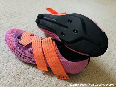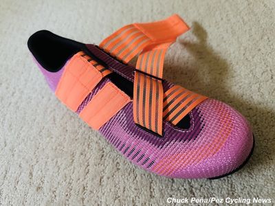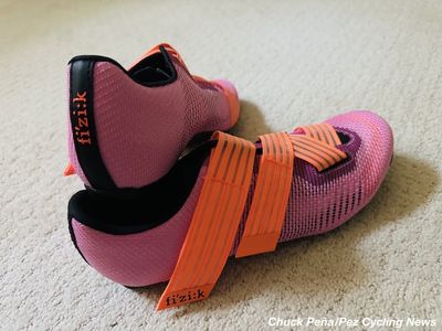 The pink with orange colorway aside, two things stand out about the Fizik Vento Powerstrap Aeroweave.