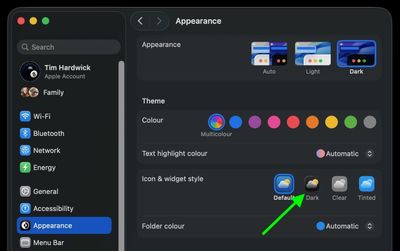 In System Settings ➝ Appearance, in the new "Icon & widget style" section, a new Dark option applies black backgrounds to icons throughout the system interface, including System Settings sidebar icons (this works in both Light and Dark modes).