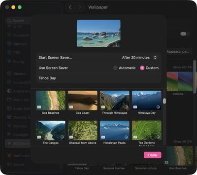 macOS Tahoe includes 15 new aerial screen savers for the Mac, each panning over natural landscapes around the world. The new screen savers can also be set as wallpapers. To browse through all screen savers on macOS Tahoe, open the System Settings app, click Wallpaper, and click the "Screen Saver…" button.