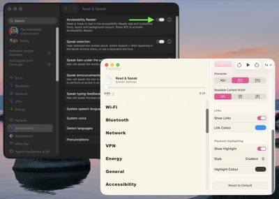 In System Settings ➝ Accessibility ➝ Read & Speak, there's a new Accessibility Reader option that, when enabled, can be used to help read things that appear on the display. Wherever text is hard to read, hit Command and Escape, and you can view the same text in a window where you can customize the text color, background color, font, spacing, links, and more. You can also have the system read the text out loud for you.