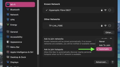 macOS Tahoe includes support for automatically joining your iPhone's Personal Hotspot when no Wi-Fi network is available, so you no longer need to manually connect. Click on the Wi-Fi button in the menu bar or Control Center to open up Wi-Fi Settings. From there, scroll down to the bottom where it says "Ask to join hotspots" and click to select the Automatic option. Auto-Join works with Family Sharing, so you can set up your Mac to automatically connect to a family member's Personal Hotspot, or allow their Mac to automatically connect to yours.
