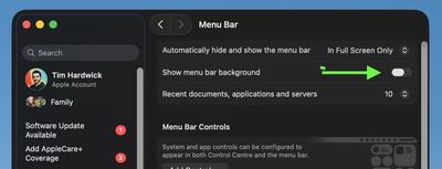 In macOS Tahoe, the Liquid Glass design overhaul makes the menu bar look less like a bar than ever because there's no longer a visible background to it. If you dislike the appearance of menu items floating at the top of your desktop, go to System Settings ➝ Menu Bar, then toggle on the switch next to "Show menu bar background."