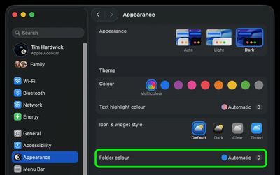 In System Settings ➝ Appearance, the default setting maintains the classic macOS look with app icons displaying their original colors. But you can now customize folder colors independently through a dedicated new "Folder Color" setting. When set to Automatic, folders retain their traditional blue appearance, but switching to other colors like purple will change all folder colors system-wide.