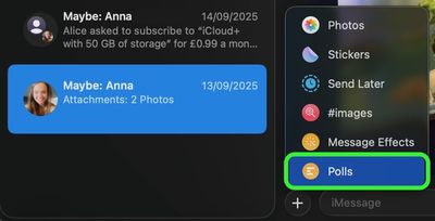 The ability to create polls in conversations has been a mainstay of rival messaging platforms. And now, Messages finally has it too. You can add up to 12 choices in a poll, and then send it to people in a conversation to vote on. If you send a poll and someone thinks an option is missing, they can even edit it and add in another choice. Note that users need to have a device with iOS 26 or macOS Tahoe installed in order to interact with polls in Message conversations.