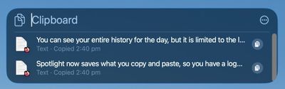 Spotlight now saves what you copy and paste, so you have a log of what you've been doing that you can go back and reference. You can see your entire history for the day, but it is limited to the last eight hours.