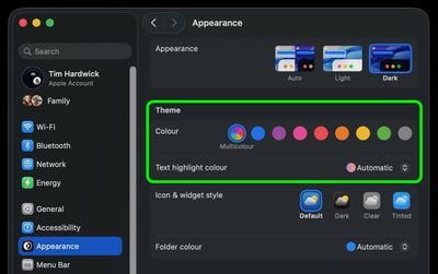 In macOS Tahoe, Apple introduces the concept of Themes, with new appearance settings that go beyond the traditional Light and Dark modes. In System Settings ➝ Appearance, there are still the standard Auto, Light, and Dark modes, but Apple has added several options that allow you to create your own stylized desktop environment. "Accent color" has become "Color," and there's a new "Text highlight color" option, so you can now make highlighted text appear in a different shade to buttons, pop-up menus, radio buttons, checkboxes, and focused outlines.