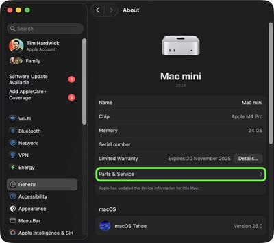 Apple has expanded its Repair Assistant calibration software to Mac. On iPhone, the tool helps calibrate replacement parts including back glass, battery, display, TrueDepth camera, and rear camera components. On Mac, Repair Assistant enables Touch ID and Lid Angle sensors to be reused after Display or Logic Board repairs on select models. Apple silicon users can access Repair Assistant through System Settings ➝ General ➝ About, where a "Parts & Service" section appears after recognized repairs.