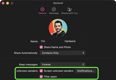 In the Messages app's Settings, there are new options to screen unknown senders (excluding verification codes) and spam, so that these messages are moved to a different section of the app interface and you aren't notified when they arrive. Switching to the separate message lists can be done by clicking the new filter icon, top right of the current list.