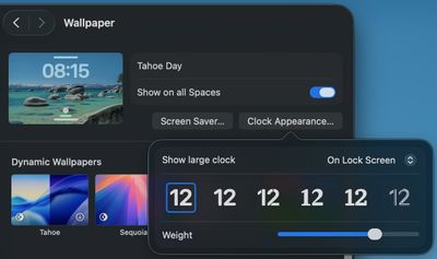 You can now change the style of the Lock Screen clock, just like in iOS 18. Simply go to System Settings ➝ Wallpaper, and click Clock Appearance... where you can adjust the font and the weight of the clock as it appears on the Lock Screen and/or Screen Saver.