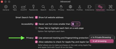 Advanced Fingerprinting Protection now automatically obscures browser and device data in all browsing modes. If you want to revert it back to Private Browsing sessions only, you can do so in the Advanced section of Safari ➝ Settings ➝ Privacy.