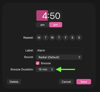 Like in iOS 26, the Clock app in macOS now gives you the ability to set your Snooze duration to between 1-15 minutes when setting alarms.