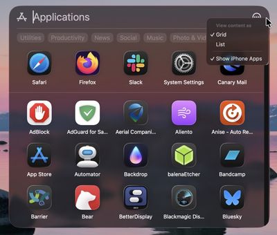 Launchpad is gone in macOS Tahoe, and will be replaced by a new Apps icon in the Dock if that's where you had Launchpad. This takes you to the Applications section of the Spotlight Search interface, where you can switch between app categories like Productivity & Finance and Utilities. A More button (three dots) lets you view apps in a Grid or List, as well as Show iPhone Apps, but apps in this view lack a right-click menu and can't be deleted from here.
