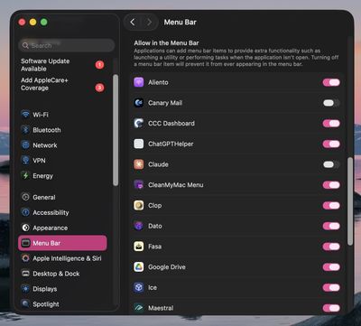 In System Settings, the new Menu Bar section includes a new "Allow in the Menu Bar" section that lists any third-party apps that can add menu bar items, so now you can selectively toggle them on and off from one place.
