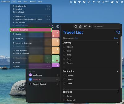 In macOS Sequoia, you can create grocery lists that the Reminders app can automatically categorize into meaningful sections for you. In macOS Tahoe, Reminders takes things up a notch. Using Apple Intelligence, the app can now auto-categorize pretty much any list that you enter. If you're packing for a vacation, for example, select File ➝ Auto-Categorize, and the app will sort your items into Clothing, Electronics, and Toiletries sections, to name just a few.
