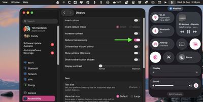 In System Settings ➝ Accessibility ➝ Display, the Reduce Transparency toggle turns off many of the translucent Liquid Glass effects in the macOS interface, so if you aren't getting used to the new design, this option should help.